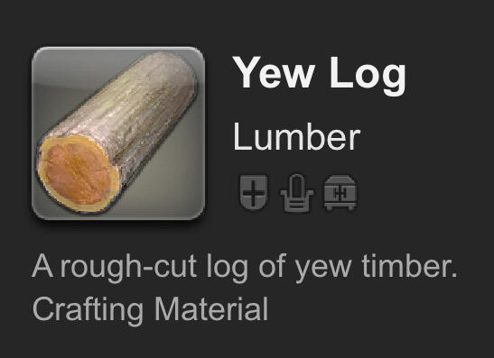 Harvested near the Nine Ivies of the East Shroud, our yew wood possesses innate properties suited to use in the making of coffins and mementos by which to remember the dead. Extremely hard, yet flexible. Attunes easily to the element of water.